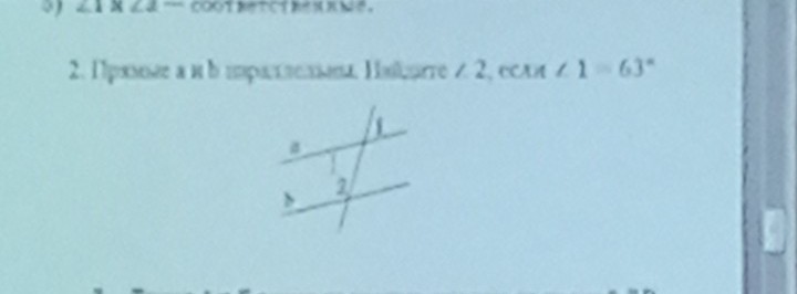 Углы 1 и 2 накрест лежащие, а при параллельных a и b, их сумма 180 гр., значит угол 2=180-63=117