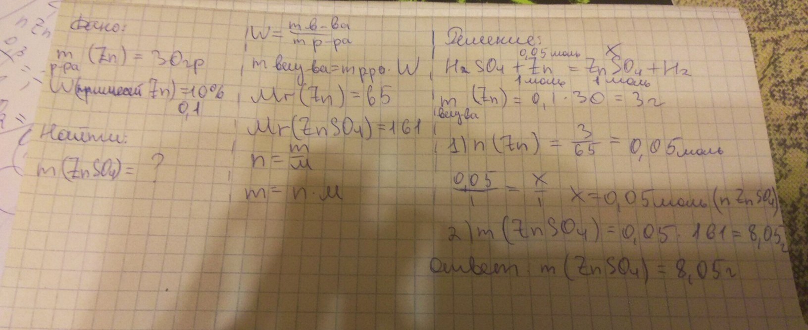 определить массу соли которая получается при взаимодействии 30 гр цинка содержащего 10 %примесей с серной кислотой