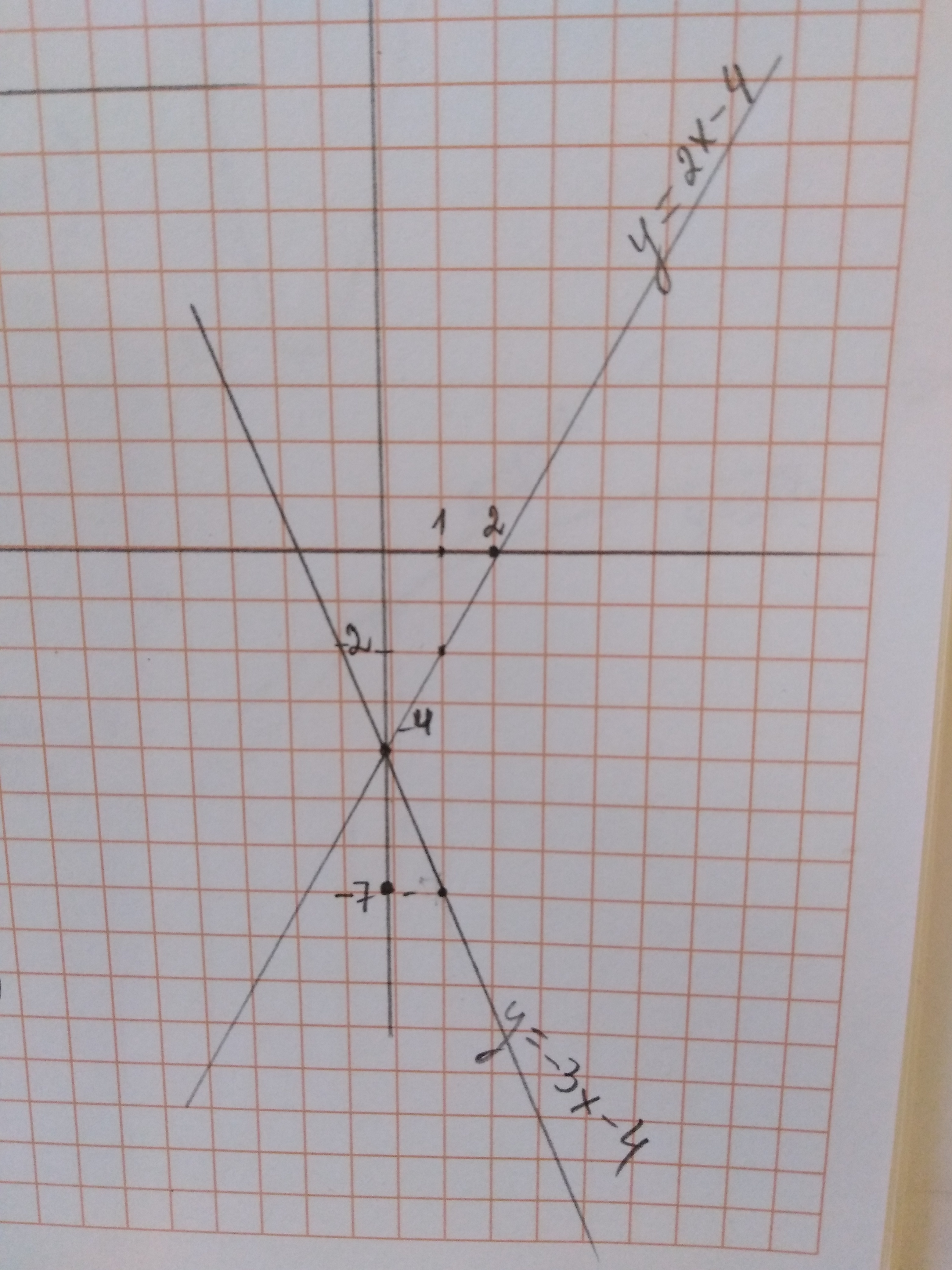 Постройте на одной координатной плоскости график функции y=2x-4 и y=-3-4 Найдите координаты точки пересечения графиков этих функций
