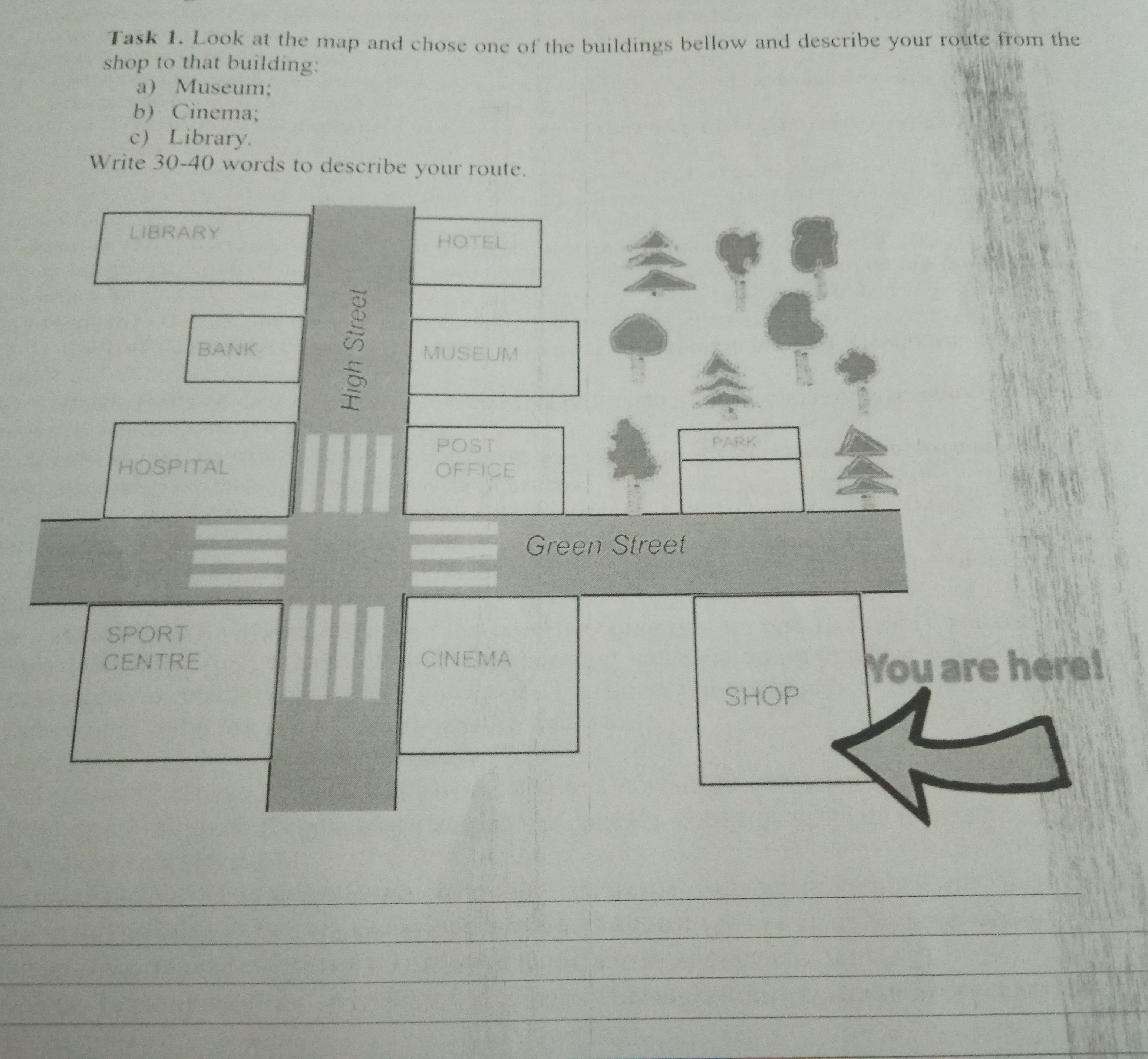 I today went to shop. In the shop were very more things. I bought a potato, tomato and bread. After shop I went to cinema. There are very interesting and cool film. In our city has different place.After cinema I went to sport center. In this I runed, jumped and other. This day was very good.