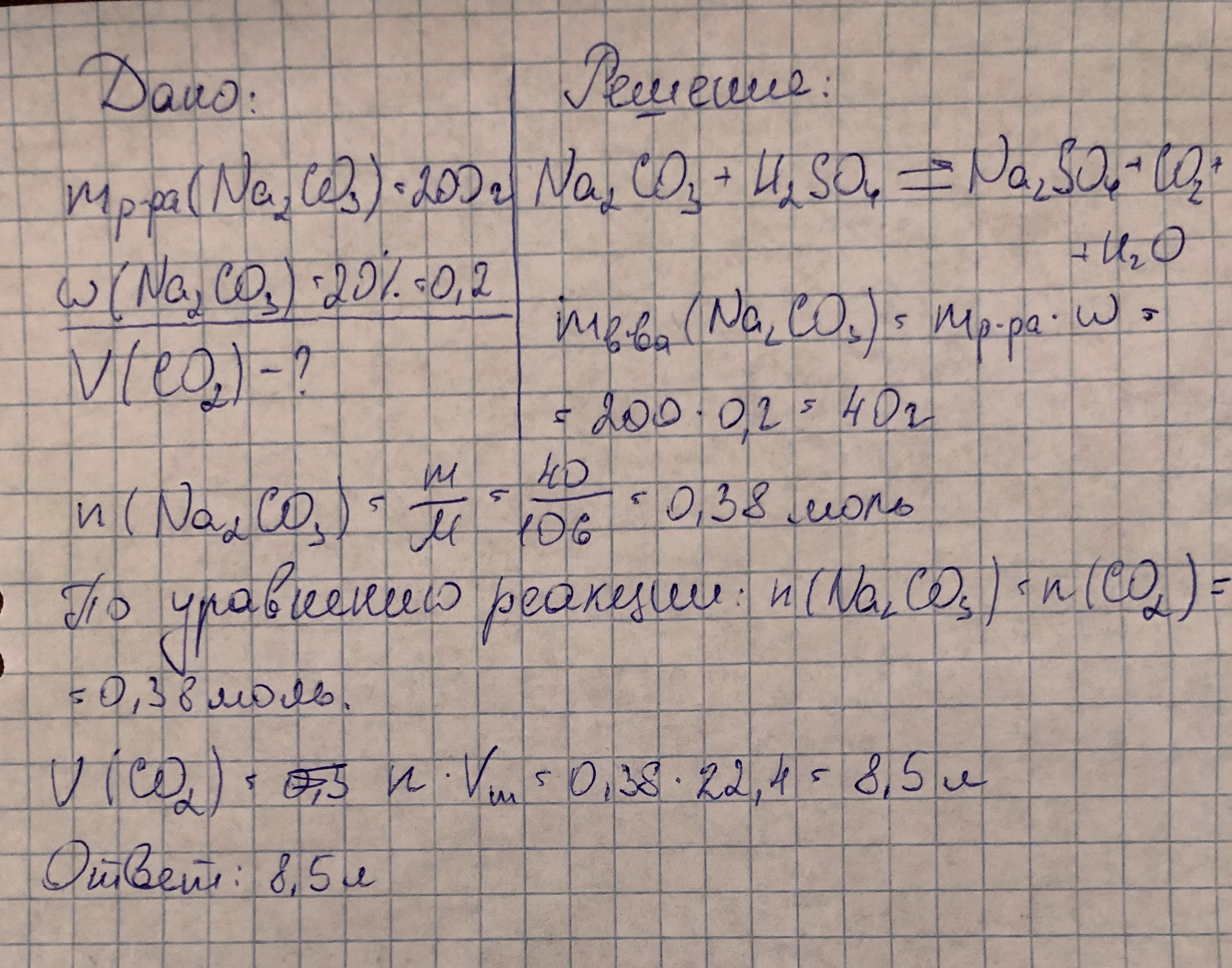 Какой объем газа выделится, если к 100г. 20% раствора карбоната натрия добавили серную кислоту (угольная кислота разлагается!)?