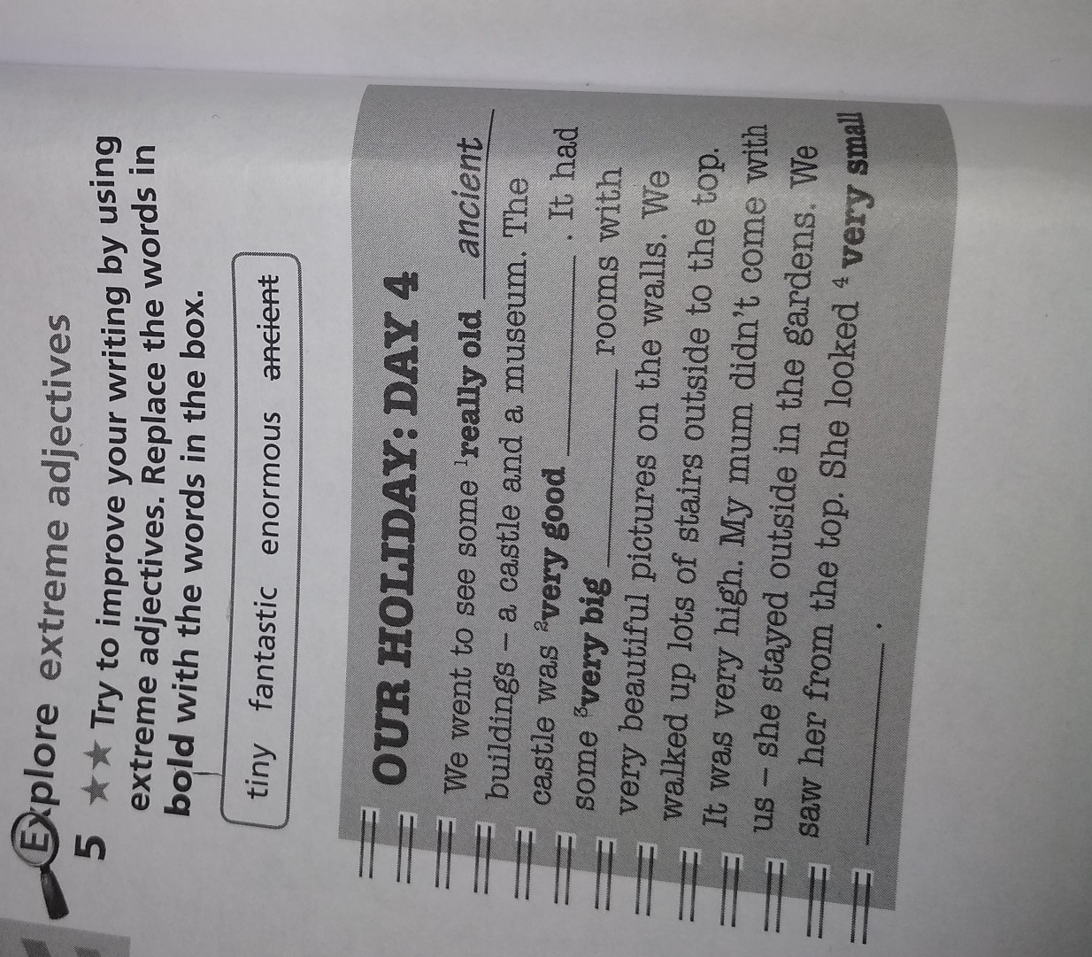 Try to improve your writing by using extreme adjectives. Replace the words in bold with the words in the box.