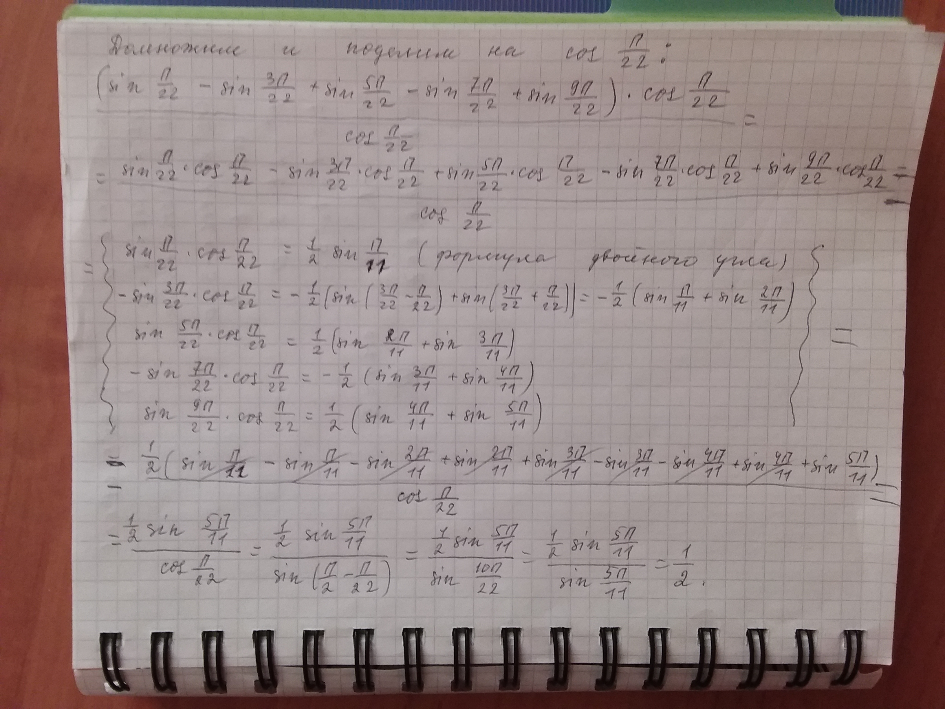 Спасибо. Решение, в целом, правильное (идея особенно понравилась),но есть одна ошибка в синусе двойного угла (там получается sin(pi/11), а не sin(pi/22)), но эта ошибка "опустилась" в ходе решения.
