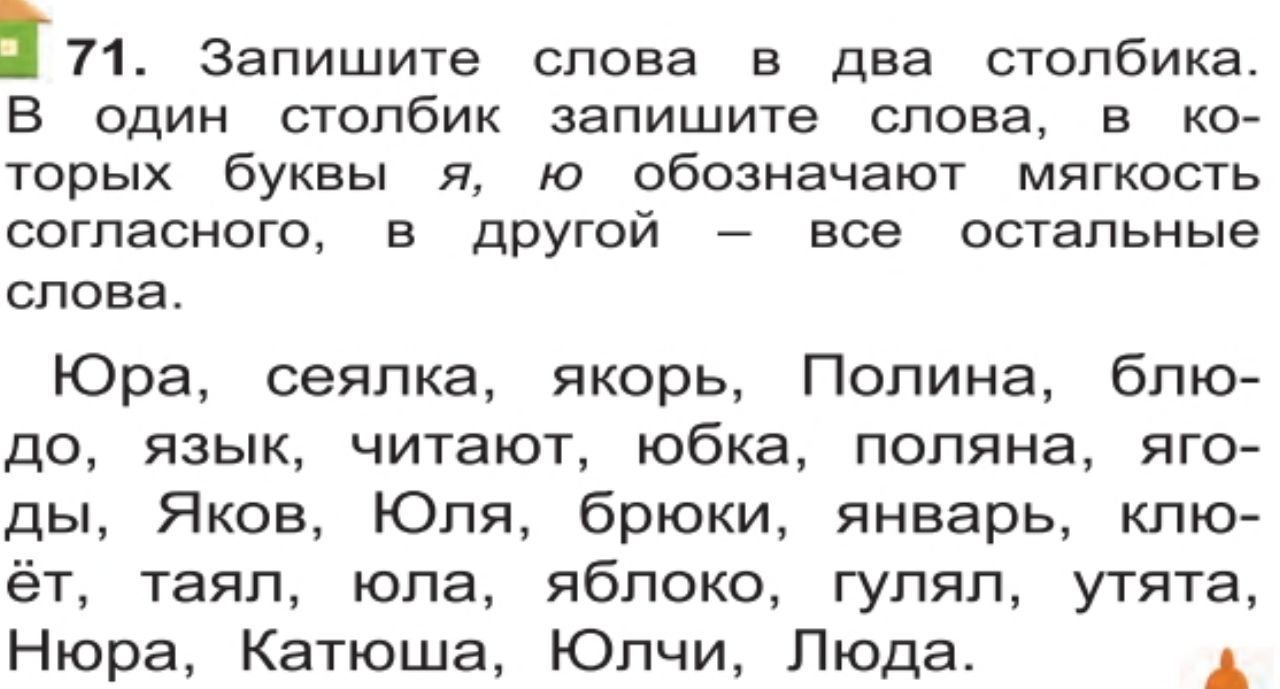 1 столбик: Поляна, Юля, клюёт, Катюша, Люда, Нюра, утята, гулял, блюдо