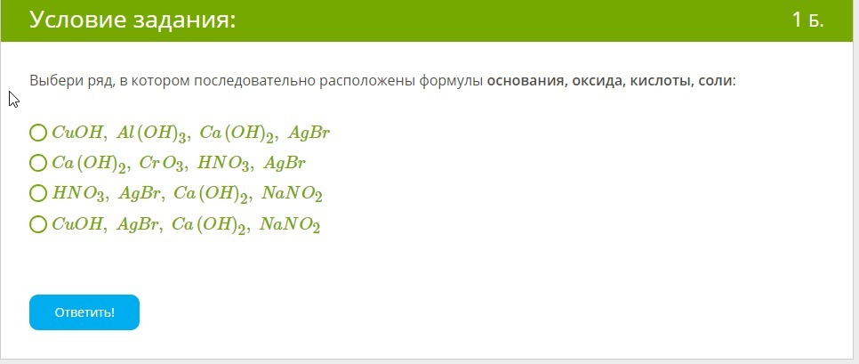 Выбери ряд, в котором последовательно расположены формулы основания, оксида, кислоты, соли: