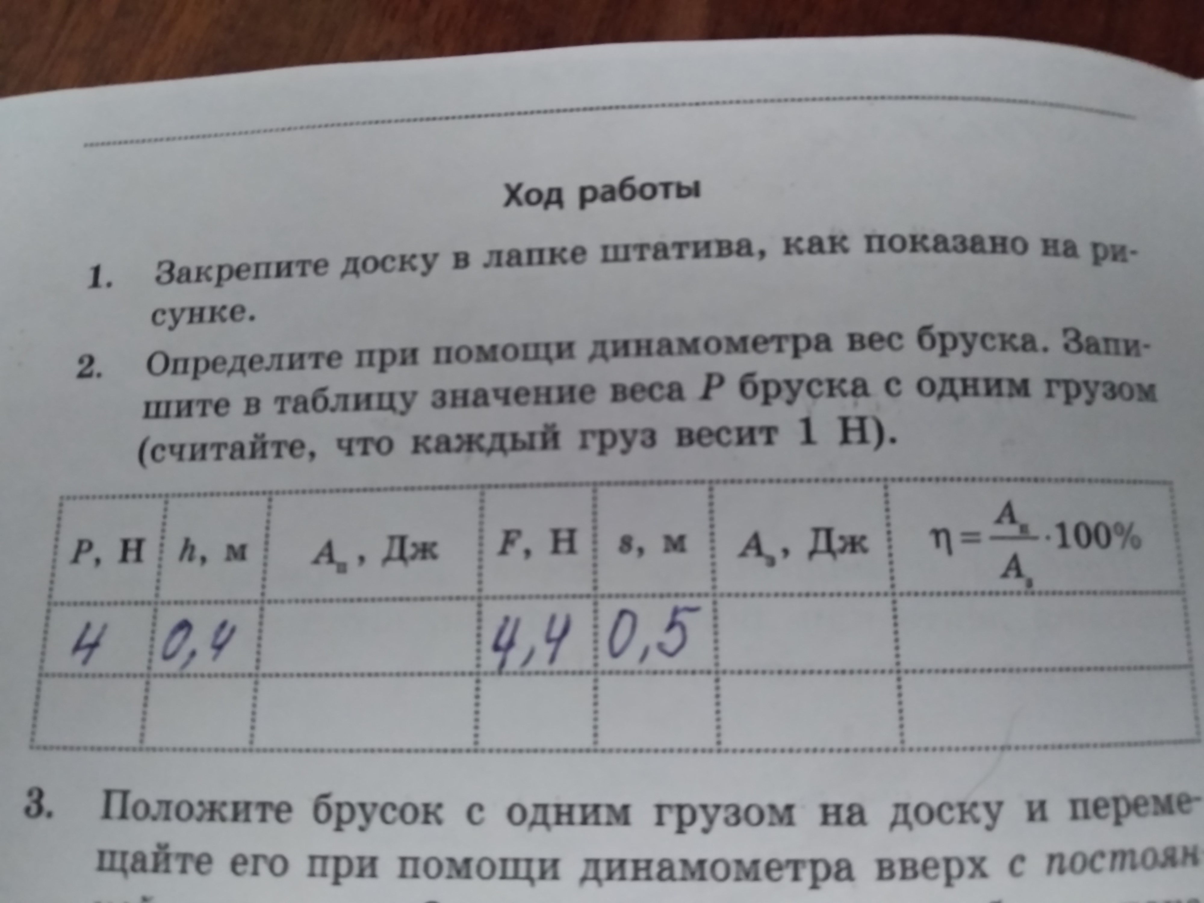 второе задание уже занесено в таблицу. Видимо было 4 груза по 1 Н прикреплены к динамометру, или 3 груза вставлены в брусок с отверстиями ( не знаю какое там у вас оборудование на лабораторной).