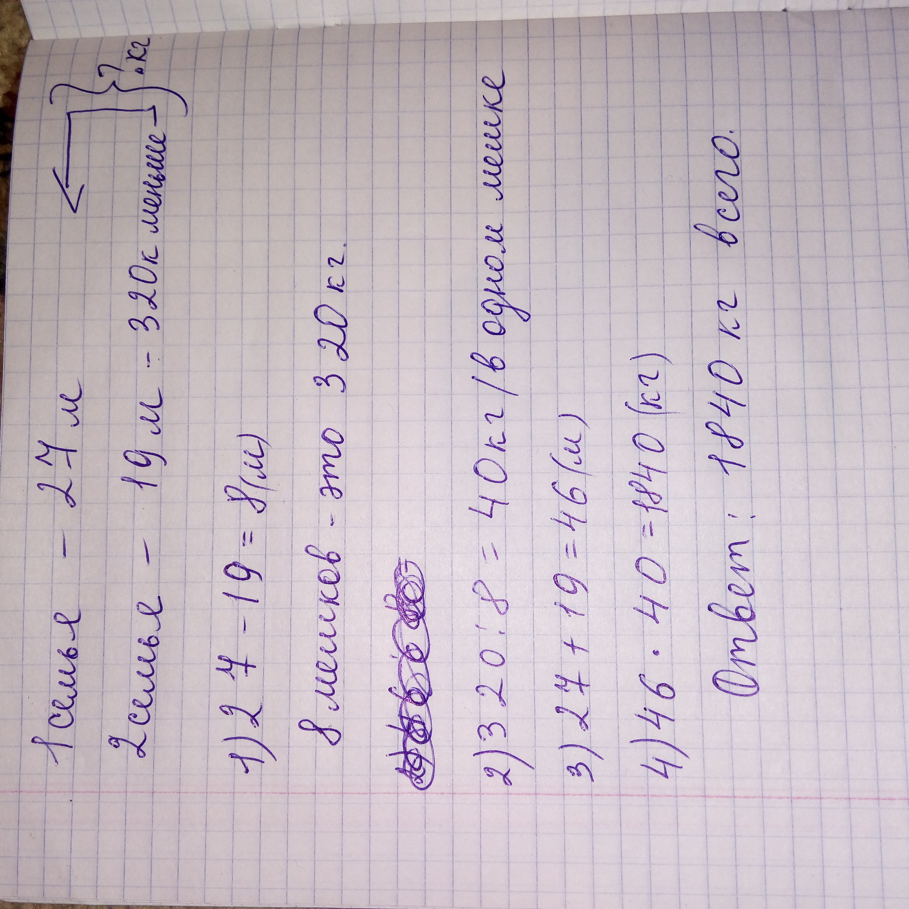 Первая семья собрала 27 мешков картошки,а другая 19 мешков.Другая семья собрала на 320 кг меньше чем первая.Сколько кг картошки собрала каждая семья
