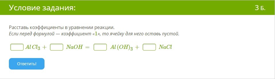 AlCl3 + 3 NaOH → Al(OH)3 + 3 NaCl