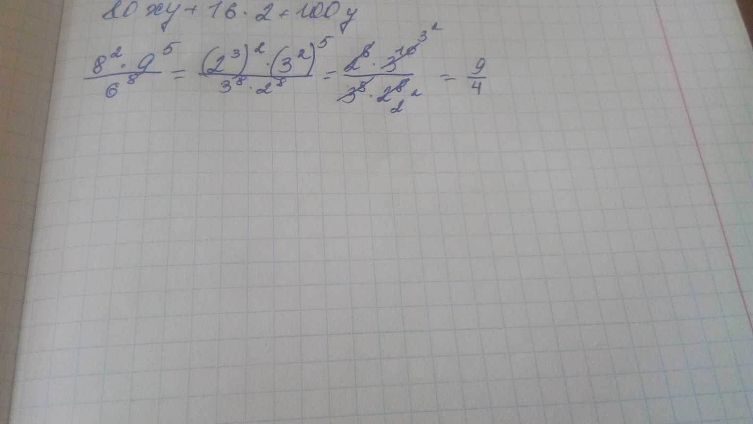 Так получается выражение вида: (2³)²*(3²)^5/(3^8*2^8). Дальше сокращаем числа с одинаковыми основами: 2^6 и 2^8; 3^10 и 3^8. Получаем ответ 9/4