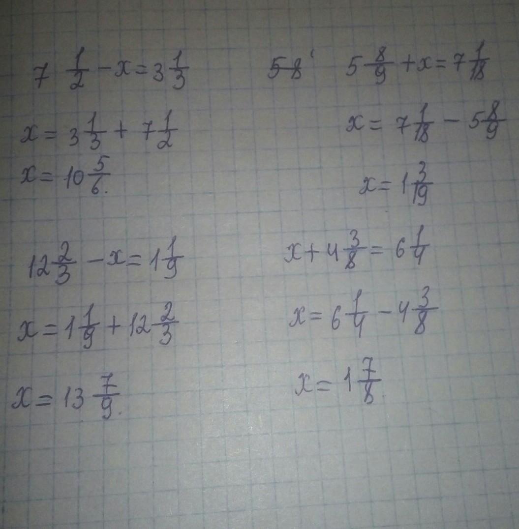 7 1/2-х=3 1/3,5 8/9+х=7 1/18,12 2/3-х=1 1/9,х+4 3/8=6 1/4решите дроби пожалуйста очень срочно!!!!!!!!!