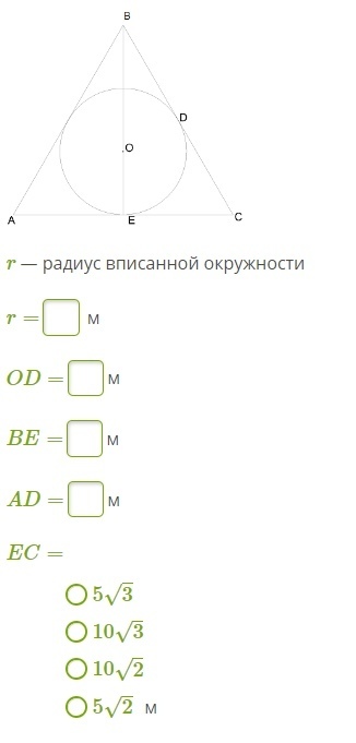 BE - медиана, биссектриса и высота, которая точкой О делится в отношении 2:1, начиная от вершины. То есть если BO = 10, то OE = 5 м. OE = OD как радиус вписанной окружности, BE = BO + OE = 10 + 5 = 15 м. AD также является медианой, биссектрисой и высотой, как AD, поэтому она тоже равна 15 м. Пусть EC = x, тогда BC = 2x (катет, лежащий против угла в 30 градусов, равен половине гипотенузы). Составим уравнение по теореме Пифагора: