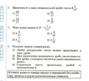 четвертое утверждение - неверное, т.к. правильные дроби со знаменателем шесть - это дроби, в которых числитель меньше шести, то есть числа 0, 1, 2, 3, 4 и 5.