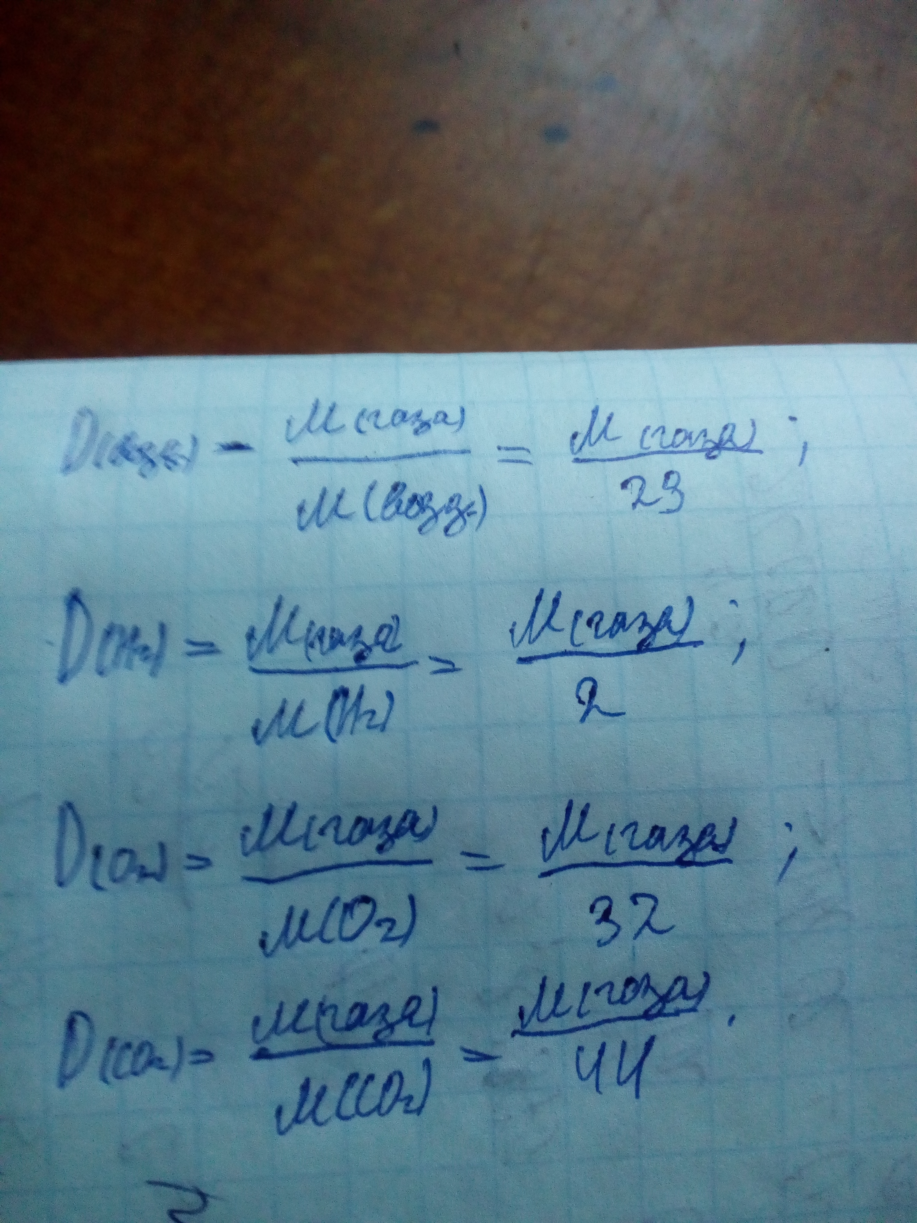 Запиши выражения для нахождения относительной плотности газа по воздуху, водороду, кислороду и углекислому газу, СРОЧНО НАДО