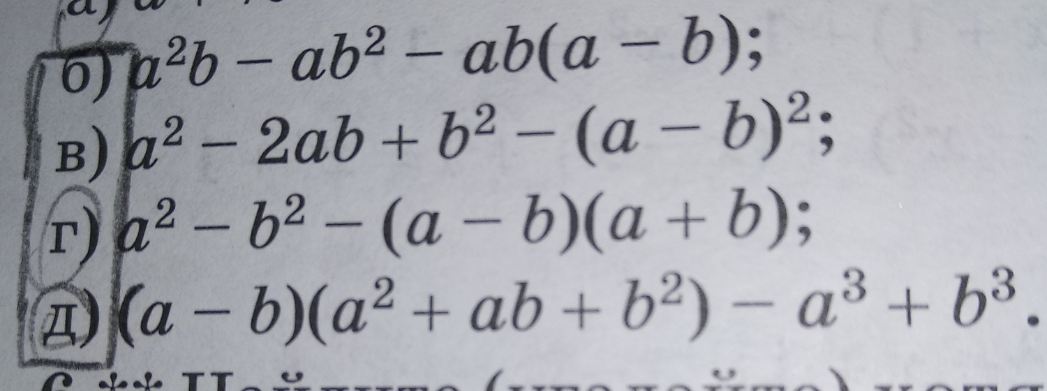Здесь просто раскроем скобки: a²b-ab²-ab(a-b)=a²b-ab²-a²b+ab²=0