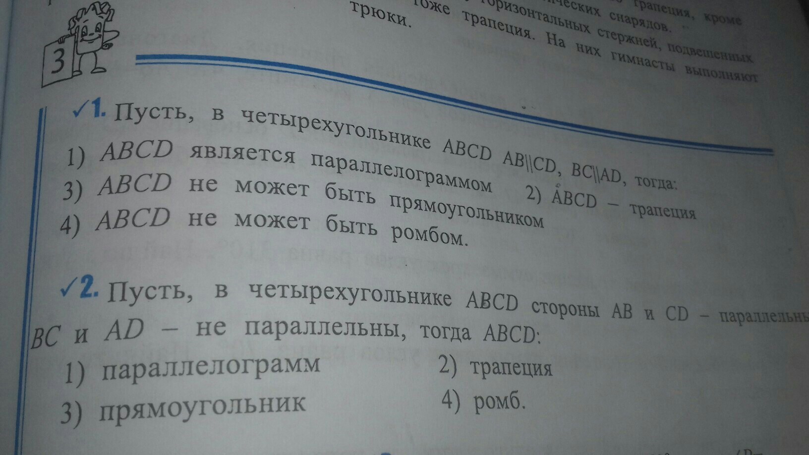 1) т к стороны параллельны, то это может быть и параллелограмм,может быть и прямоугольник и так же может быть ромб, в трапеции только 2 стороны могут быть параллельны....а так как вопрос стоит не может являться ромбом или параллелограммом -значит это не верное утверждение( они могут ими быть) значит не отмечаешь эти утверждения