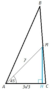 В треугольнике ABC проведена медиана АМ -7см. Найдите сторону BC , если AC=3√3 , угол МАС=45*. C подробными объяснениями , пожалуйста.