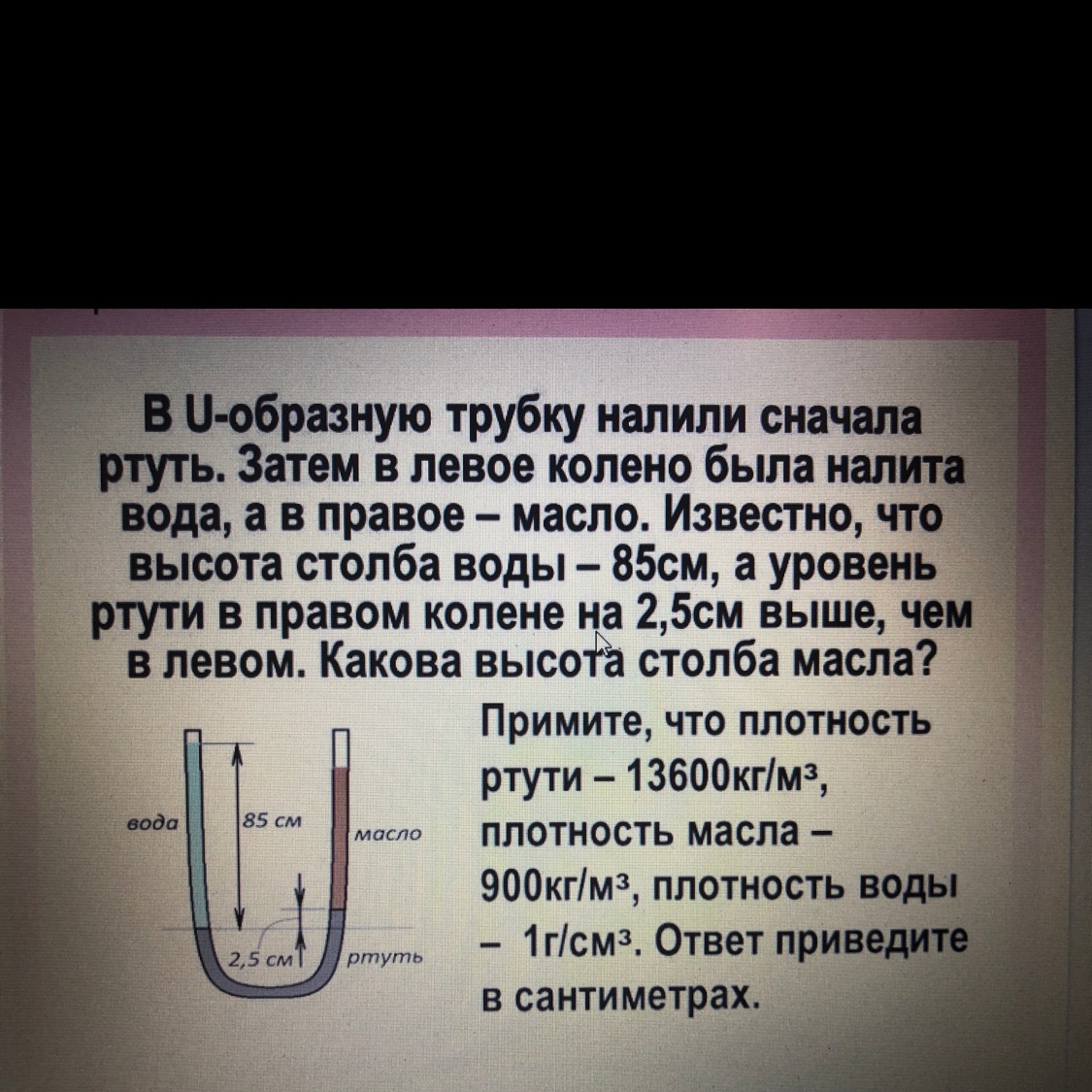 Понятно, что плотность масла больше плотности воды, а ртуть - масла. Если так судить, то, если воды было налито 85 см, а ртуть в правом колене на 2,5 см больше, чем в левом, то масла было налито (85-2,5=82,5 см) Не полагайся на мой ответ и дождись ответа от дугого человека, если никто не ответит, то возьми этот ответ!