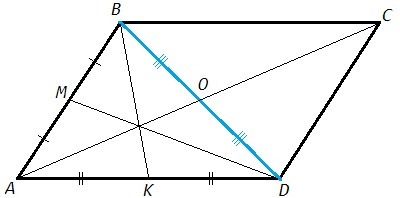 Проведем диагональ BD. Диагонали параллелограмма точкой пересечения (O) делятся пополам, BO=OD. В треугольнике ABD отрезки AO, BK, DM являются медианами. Медианы треугольника пересекаются в одной точке.