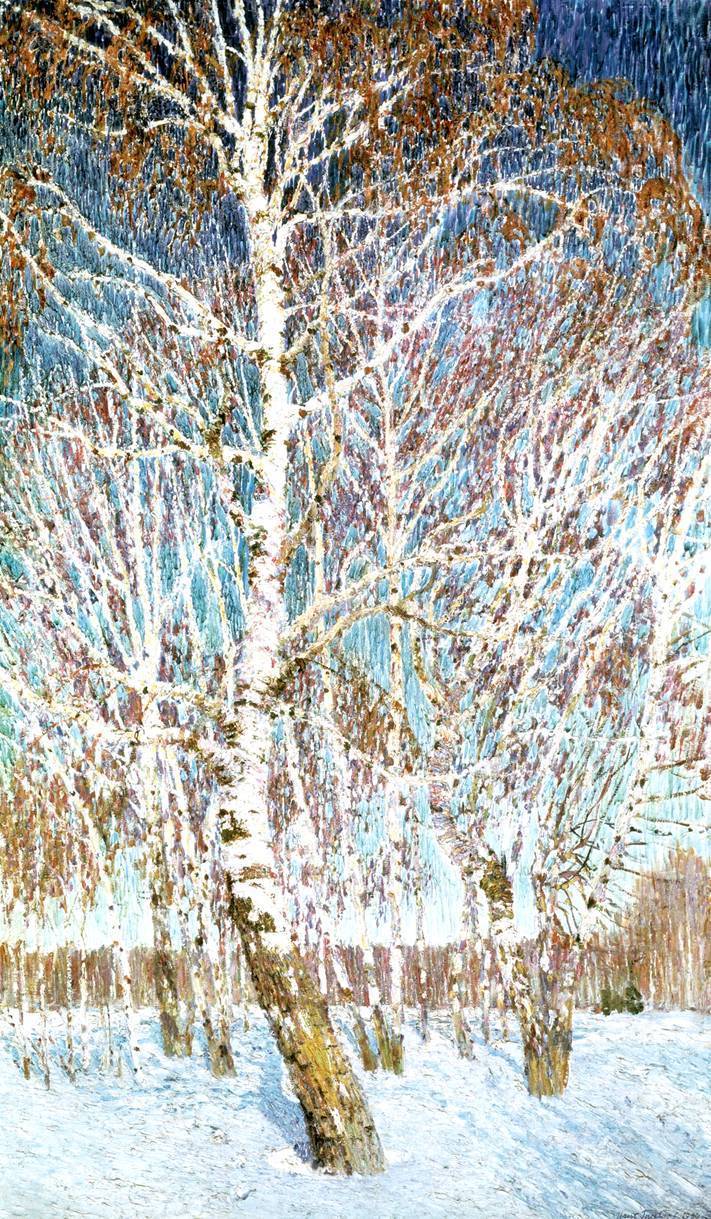 На картине художника Игоря Грабаря «Февральская лазурь» нарисован зимний пейзаж. На картине очень поражают цвета! Изображен февральский день, а на картине мало белого цвета. Больше ярких весенних цветов. Художник этим передает, что скоро кончится зима и придет весна. На заднем плане изображен лес, который нарисован такими же красивыми цветами. На переднем плане изображена красавица береза. Ее ствол слегка изогнут.