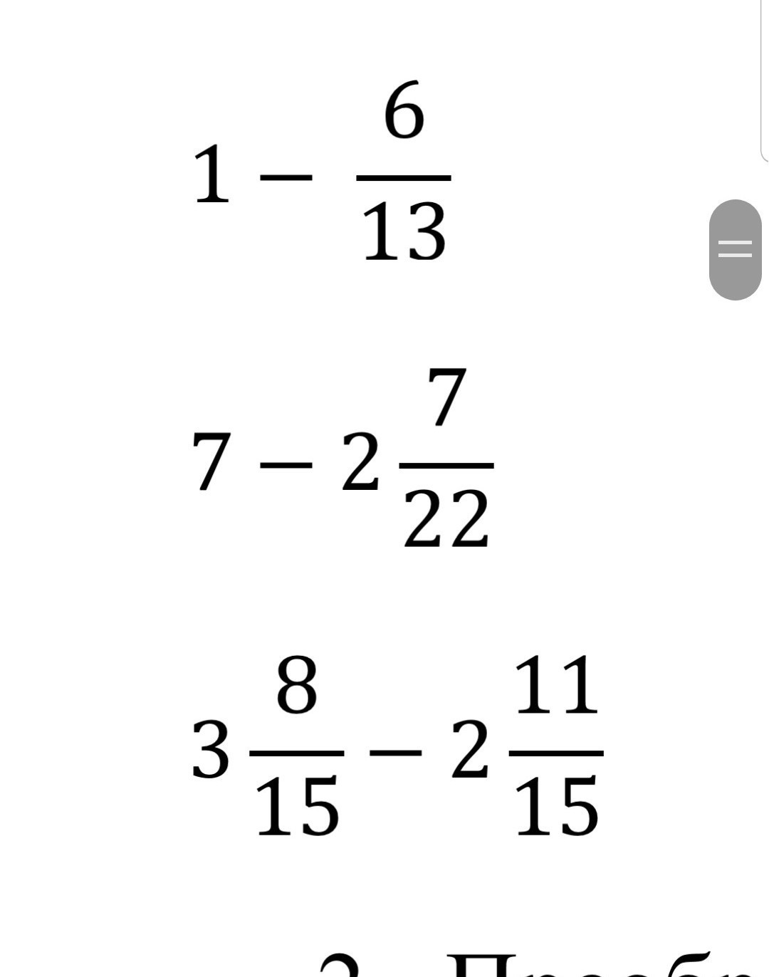 1 -  frac{6}{1 3}  =  frac{1}{ 1}  -  frac{6}{13}  =  frac{13}{13}  -  frac{6}{13}  =   \  = frac{13 - 6}{13}  =  frac{5}{13}