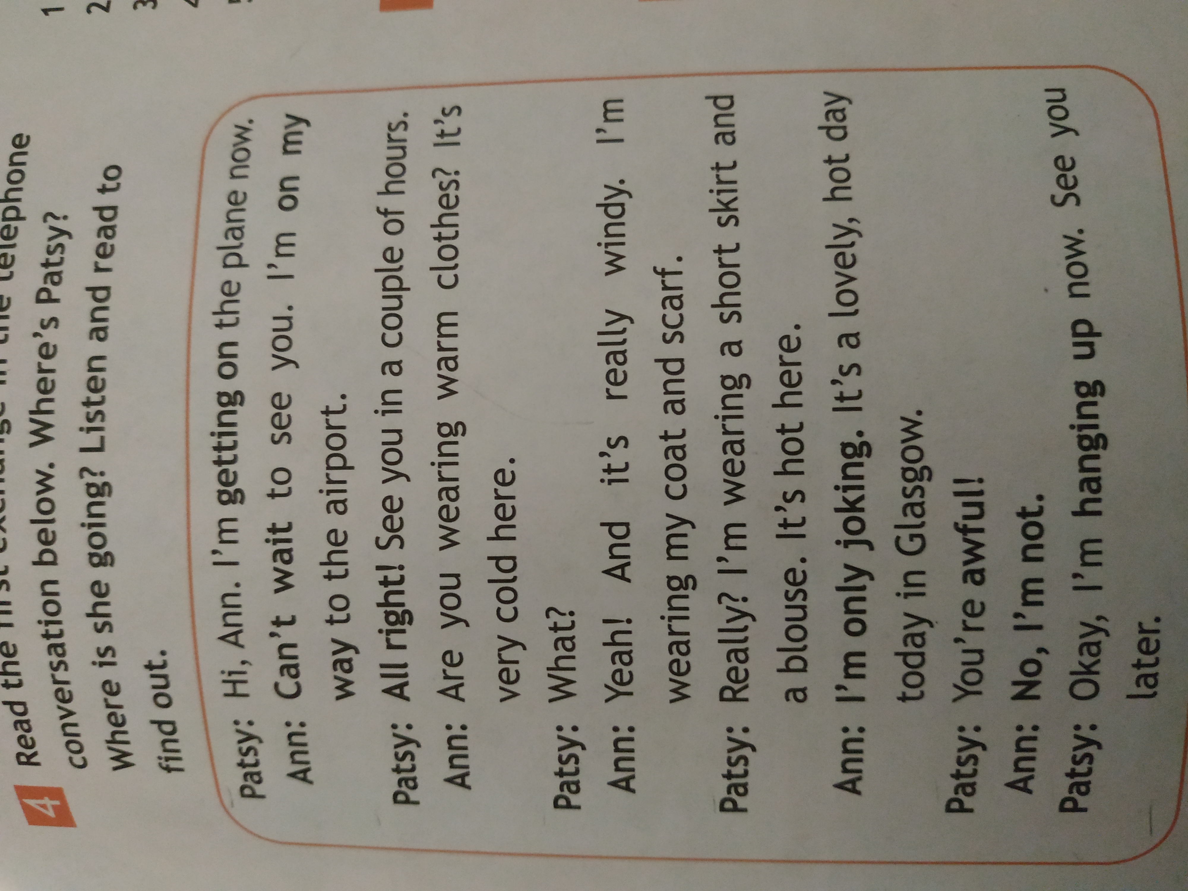 Пэтси: Привет, Энн. Я сейчас в самолете. Энн: Не могу дождаться встречи с тобой. Я еду в аэропорт. Пэтси: Хорошо! Увидимся через пару часов. Энн: Ты носишь теплую одежду? Здесь очень холодно. Пэтси: Что? Энн: Да! И это действительно ветрено. Я Пэтси: Правда? На мне короткая юбка, а Энн: я только шучу. Прекрасный, жаркий день. Пэтси: Ты ужасна! носить мое пальто и шарф. Блуза. Здесь жарко. сегодня в Глазго Энн: нет, я не. Ладно, я вешаю трубку. До скорого.