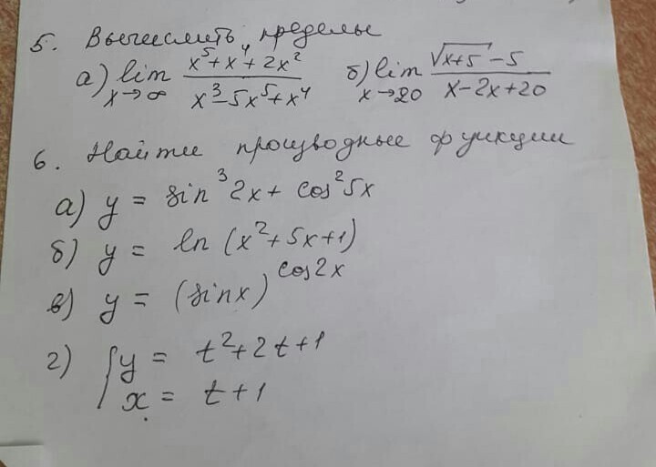 3); ; y=sin^32x+cos^25x\\y'=3cdot sin^22xcdot cos2xcdot 2+2cos5xcdot (-sin5x)cdot 5=\\=6cdot sin^22xcdot cos2x-5sin10x\\4); ; y=ln(x^2+5x+1)\\y'=frac{1}{x^2+5x+1}cdot(2x+5)\\5); ; y=(sinx)^{cos2x}\\lny=cos2xcdot ln(sinx)\\frac{y'}{y}=-2sin2xcdot ln(sinx)+cos2xcdot frac{cosx}{sinx}=-2sin2xcdot ln(sinx)+cos2xcdot tgx\\6); ; left { {{y=t^2+2t+1} atop {x=t+1}} right. ; ; ,; quad t=x-1\\y'_{x}=frac{y'_{t}}{x'_{t}}=frac{2t+2}{1}=2t+2=2(t+1)=2(x-1+1)=2x