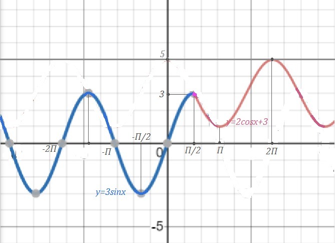 1. Строим график y=3sinx , растягивая график ф-ции y=sinx в 3 раза вдоль оси ОУ. При х=П/2 получаем точку (П/2;3) , она на графике выколота.