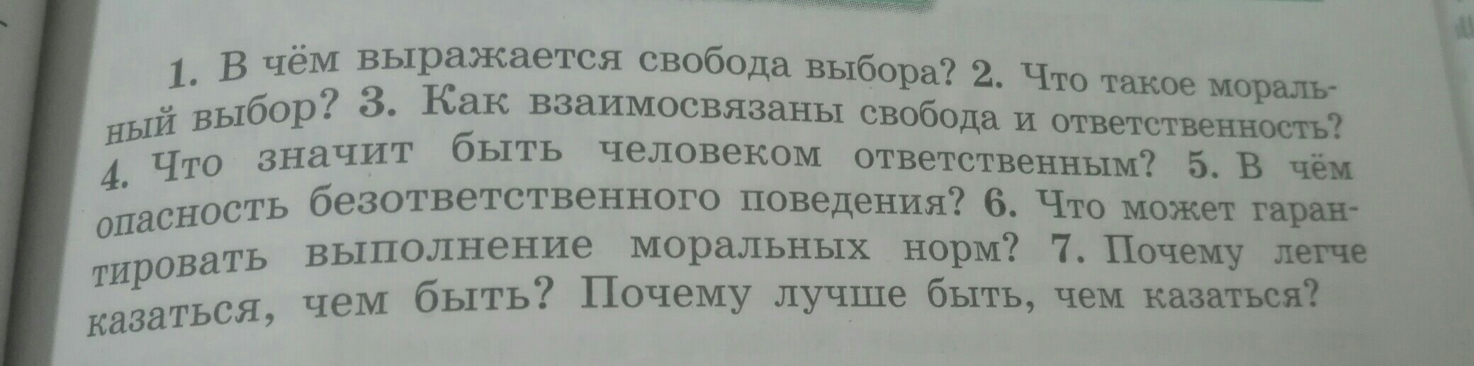 1) В праве человека решать , что ему делать , а что не делать . 2) выбор основанный на морали или выбор основанный на внутренних правилах . 3) человек имеет и свободу и ответственность , человек несёт ответственность за все действия , которые он совершает : Убил человек , сел в тюрьму на 200 лет ) . 4) нести ответственность за свои поступки . 5) оно опасно для общества . Например : Я преступник , захотел удил несколько человек , долго скрывался от полиции и совершенно не ощущаю отвественности за совершенные убийства . 6) Правоохранительные органы .7) потомучто человеку необходимо приспосабливаться к новым условиям и своему новому окружению , в следствии чего он вынужден порой принимать то , чего он раньше не принимал . Пример : Я не курящий человек , но из за работы был вынужден Начать . Лучше быть чем казаться , потомучто ты сам знаешь себе цену , люди вокруг знают , что тебе можно доверять , соотвественно появляется круг людей , которые могу вступиться за тебя . Например : я всю жизнь работал программистом , и по рекомендации друзей , стал главой отдела .