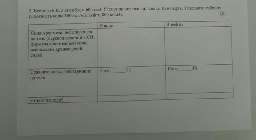 все тела 6Н , а его объем 600м3 . Утонет ли это тело а) в воде в) в нефти . Заполните таблицу . (Плотность воды 1000кмм^3 . нефти 800кмм^3)