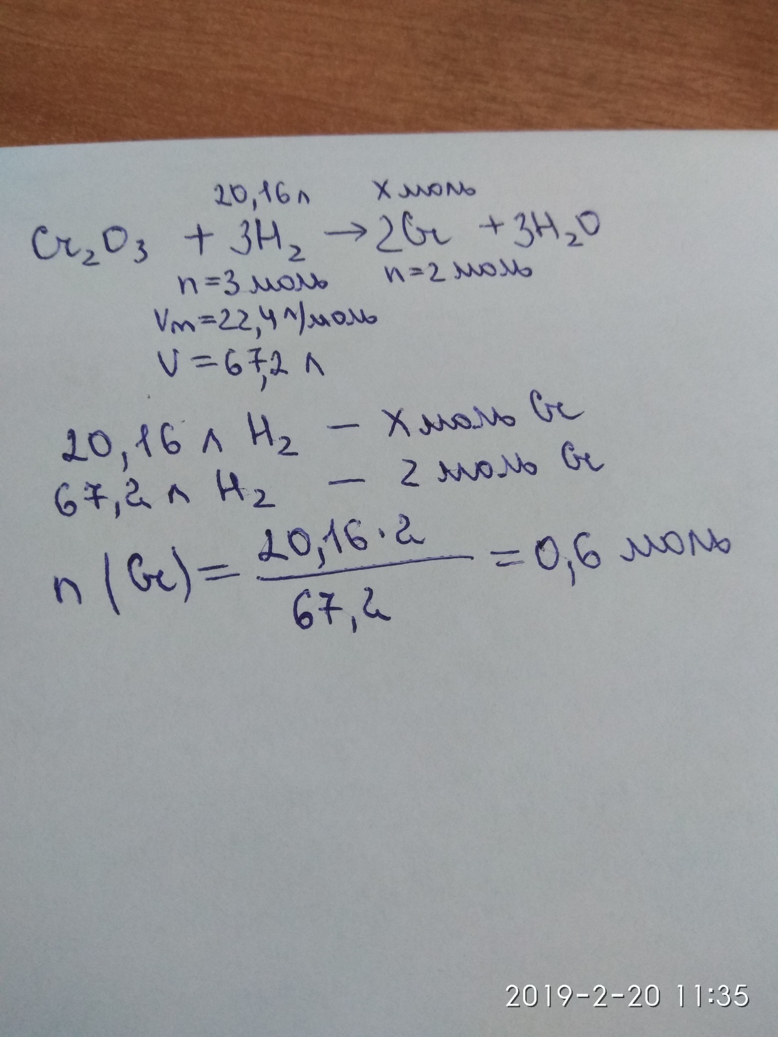1. Рассчитайте количество вещества хрома, которое может быть получено из оксида хрома (III), если для его восстановления потребовалось 20,16 л водорода (н.у.). Вторым продуктом реакции является вода.