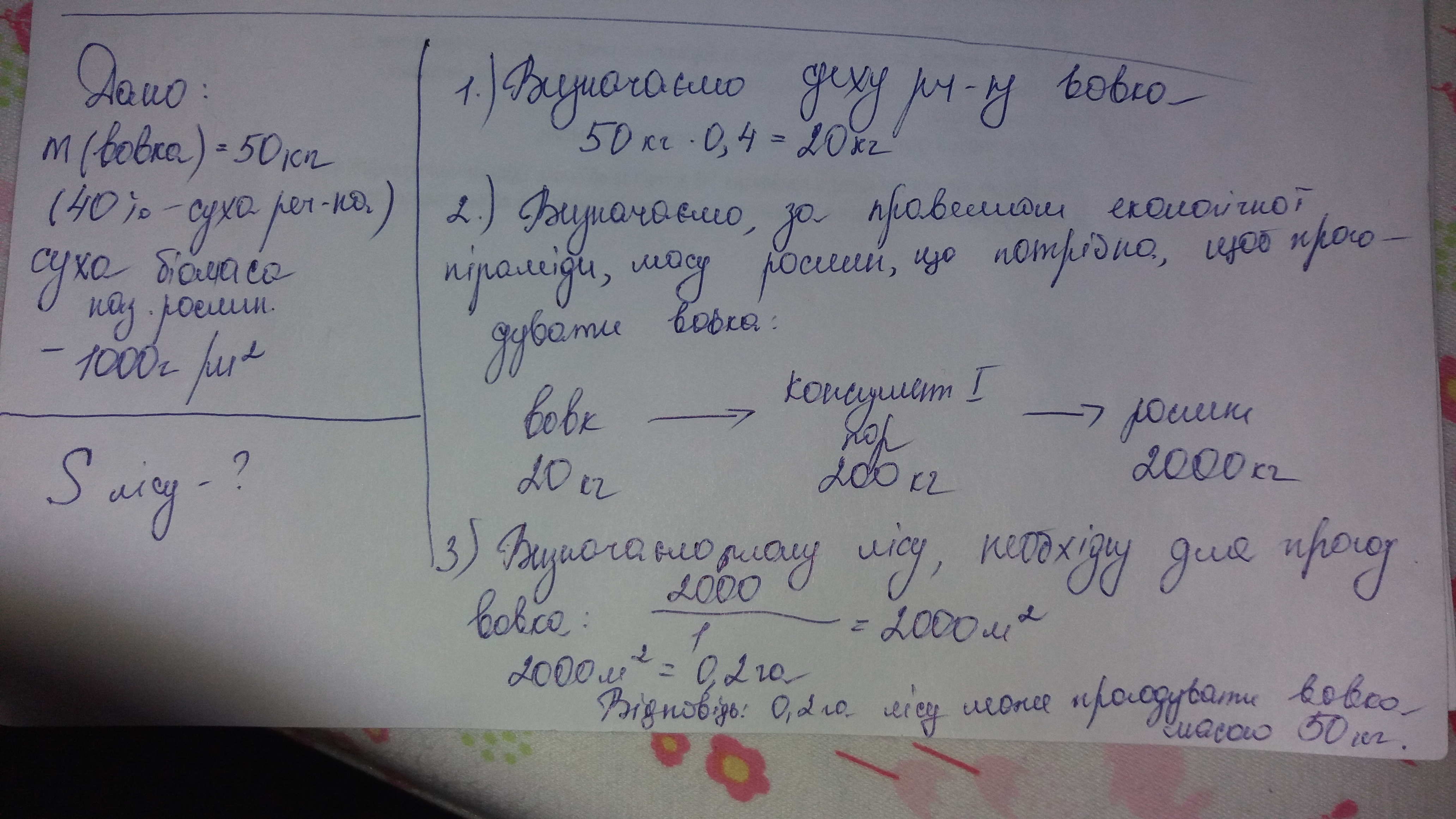 Яка площа (га) лісу може прогодувати вовка (маса вовка – 50 кг, 40 % від маси тіла становить суха речовина; суха біомаса наземних рослин — 1000 г/м2).