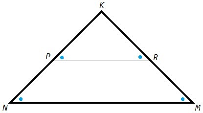 Отрезок PR соединяет середины сторон △NKM и является его средней линией. Средняя линия параллельна основанию, PR||NM. Соответственные углы при параллельных равны, ∠KPR=∠KNM=46. △NKM - равнобедренный, углы при основании равны, ∠KMN=∠KNM=46.