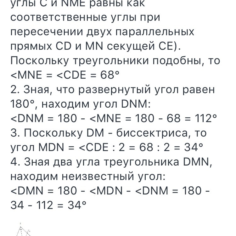 Помогите! Отрезок DM- биссектриса треугольника CDE. Через точку М проведена прямая , параллельная стороне СD и пересекающая сторону DE в точке N. Найдите углы треугольника DMN, если угол CDE = 68 градусов.