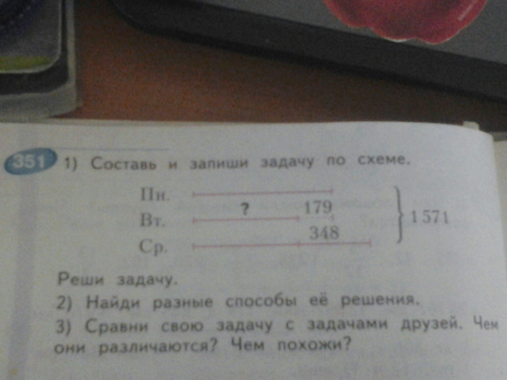 Во вторник в библиотеку привезли на 179 книг меньше, чем в понедельник. А в среду на 348 книг больше, чем во вторник. Сколько книг привезли в каждый из дней, если всего привезли 1571 книгу?