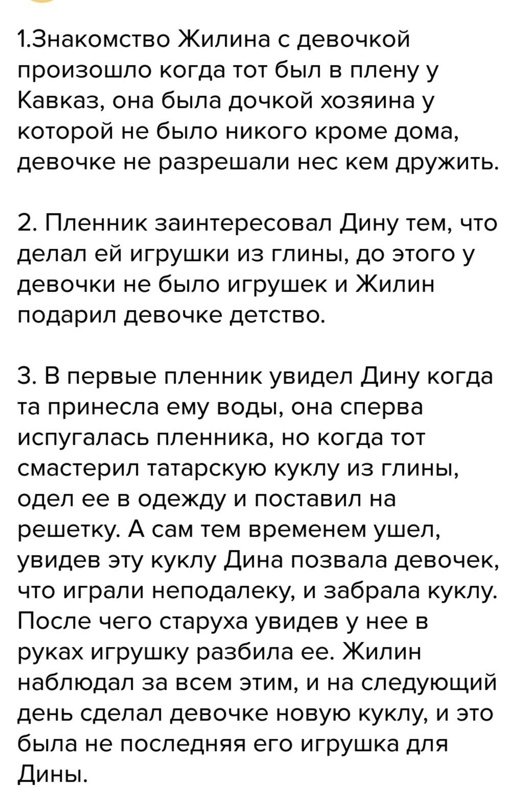3. В первые пленник увидел Дину когда та принесла ему воды, она сперва испугалась пленника, но когда тот смастерил татарскую куклу из глины, одел ее в одежду и поставил на решетку. А сам тем временем ушел, увидев эту куклу Дина позвала девочек, что играли неподалеку, и забрала куклу. После чего старуха увидев у нее в руках игрушку разбила ее. Жилин наблюдал за всем этим, и на следующий день сделал девочке новую куклу, и это была не последняя его игрушка для Дины.