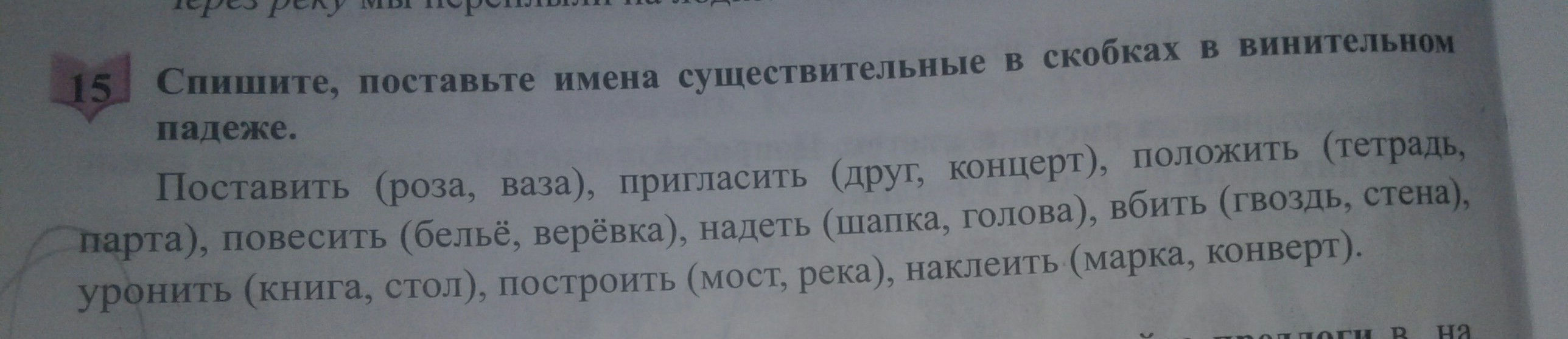 Поставить розу, поставить вазу, пригласить друга, пригласить на концерт, положить тетрадь, положить на парту, повесить бельё, повесить верёвку, надеть шапку, надеть на голову, вбить гвоздь, вбить в стену, уронить книгу, уронить на стол, постоить мост, постоить на реке, наклеить марку.