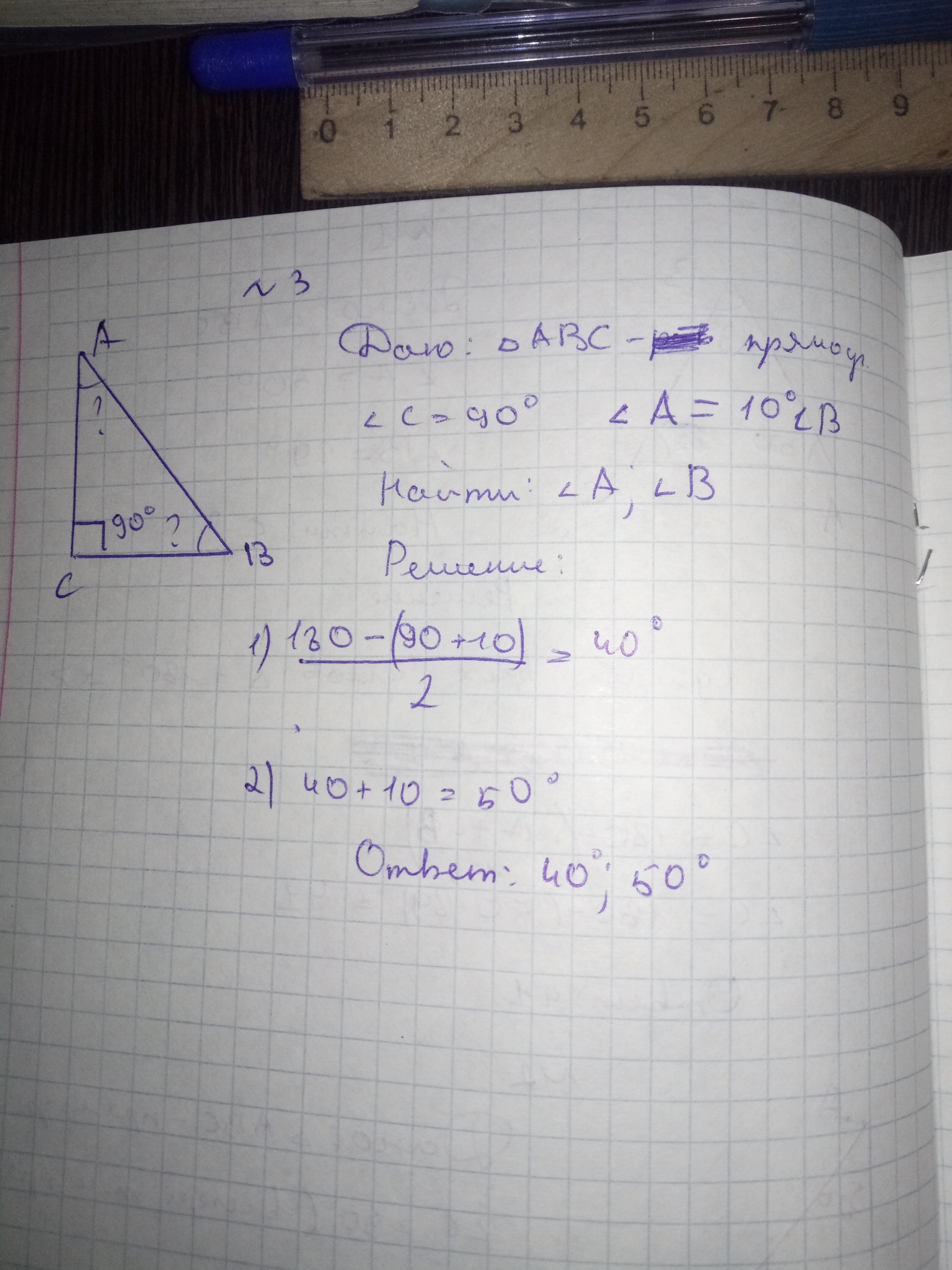 3. Найдите острые углы прямоугольного треугольника,если один угол больше второго на 10 градусов.
