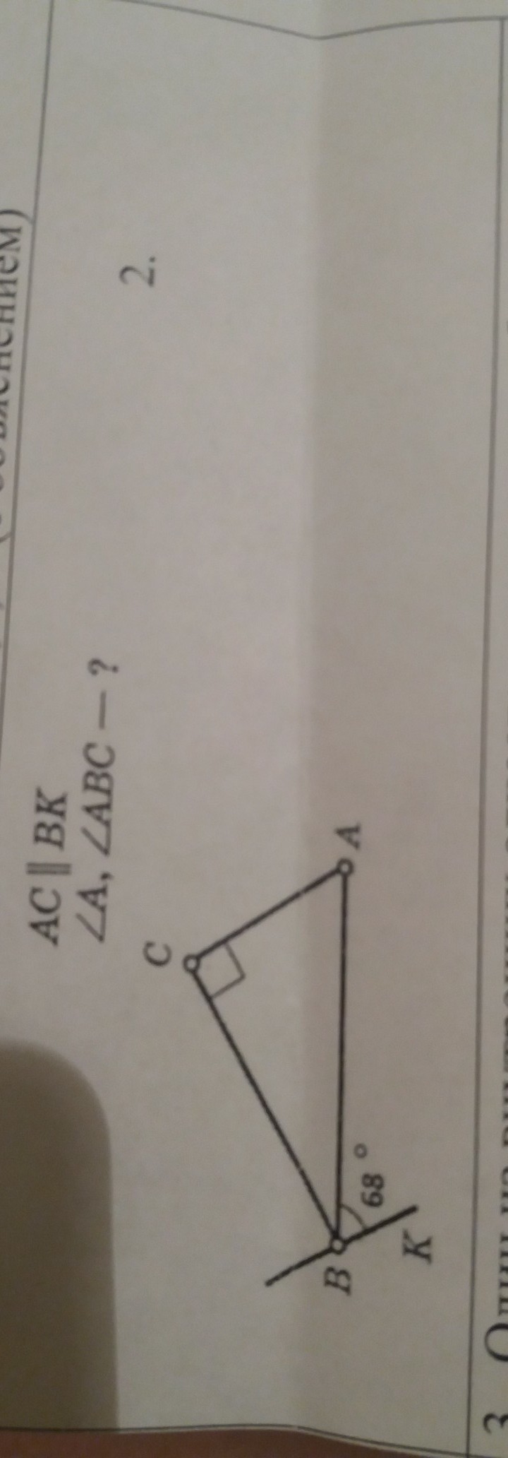 1. т.к. AC||BK, то ∠A=∠ABK=68°, т.к. они накрест лежащие.