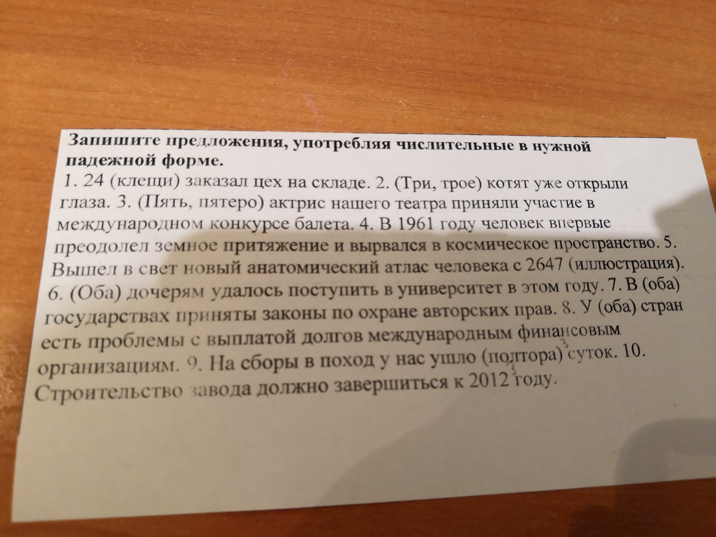 1.Двадцать четыре клещей заказал йех на складе.2.Трое котят уже откоыли глаза.3Пять актрис нашего театра приняли участие в международном конкурсе балета.4В тысяча шестьдесят первом году человек впервые преодолел земное притяжение и вырвался в космическое пространство.5 Вышел в свет новый анотомический атлас человека с две тысячи шестсот сорок седьмого .6Обеим дочерям удалось поступить в университет в этом году .7В обеих государствах приняты законыпо охране авторских прав.8У обеих стран есть проблемы с выплатой долгов международным финансовым организациям.9На сборы в поход у нас ушло полтора суток.10Строительство завода должно завершится к две тычяча двегадцатому году.