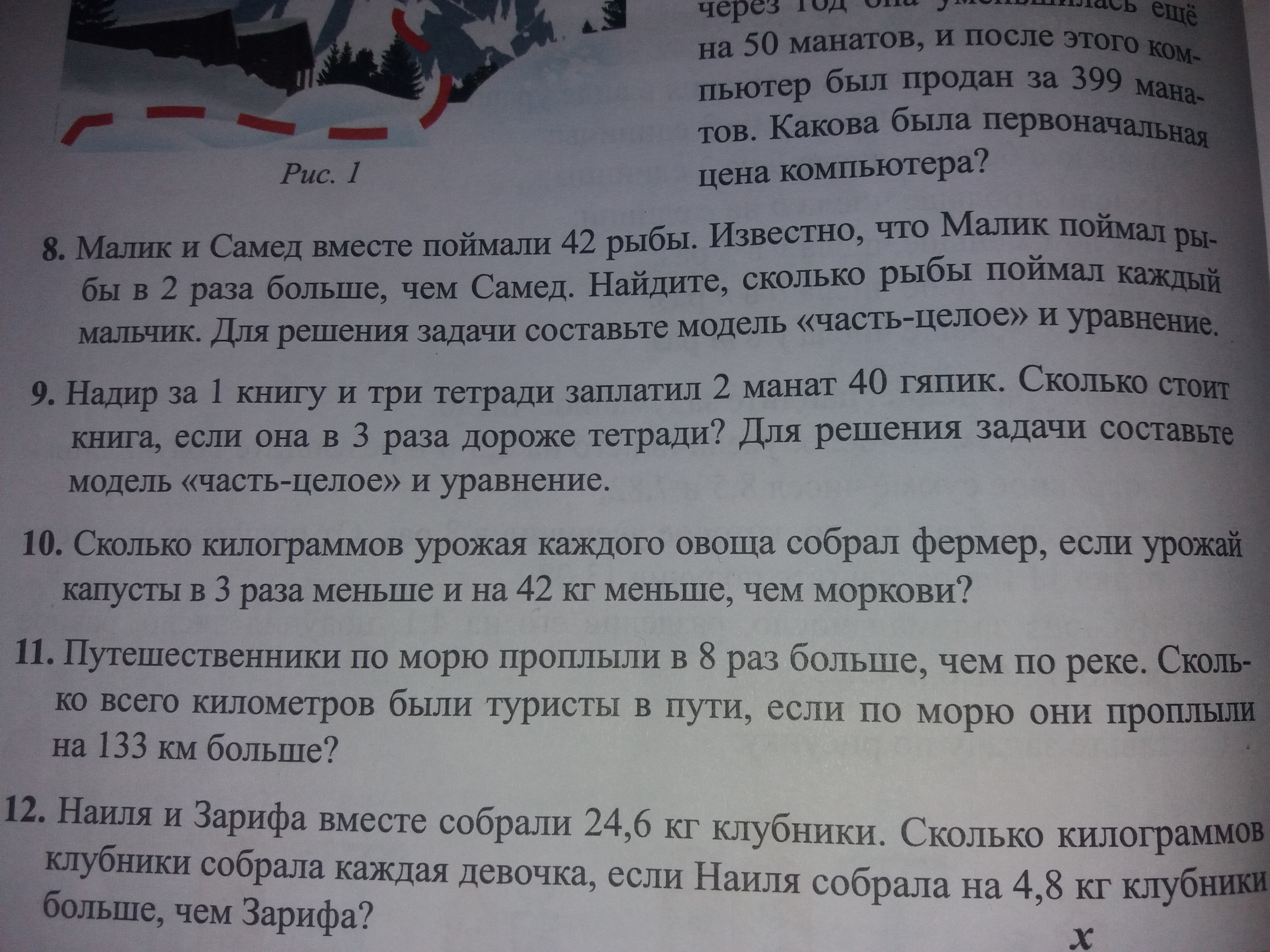 Тетрадь стоит х, книга 3х, от сюда х+3х=2,40, 4х=2,40, х=0,6, ответ, тетрадь стоит 0,6, книга 3*0,6=1,8
