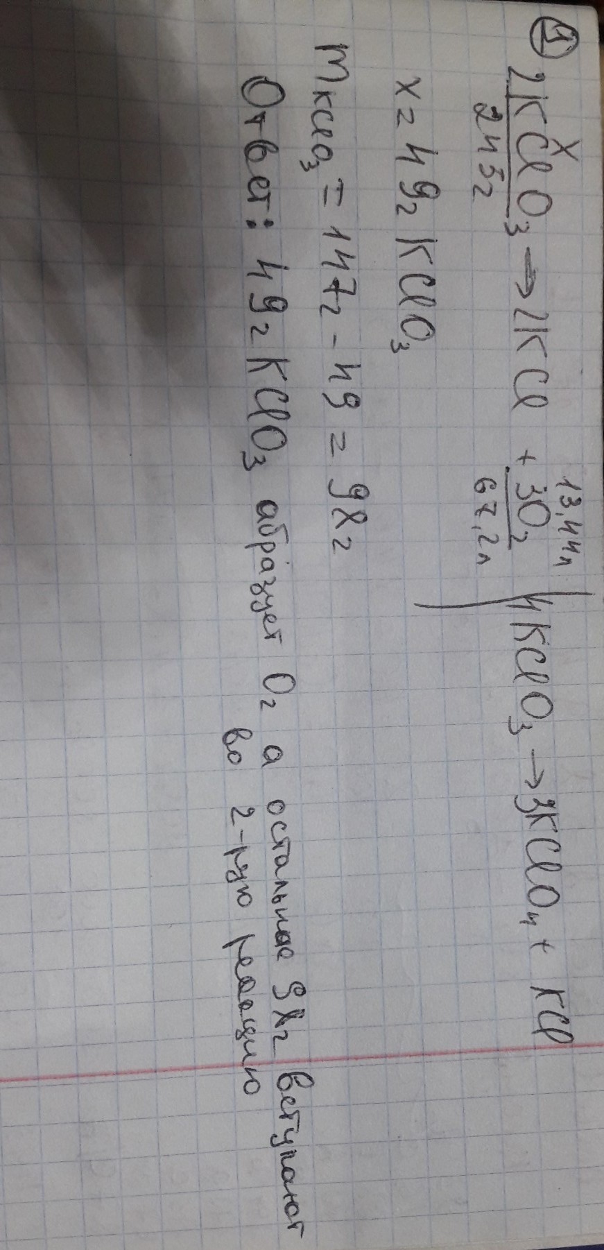 При нагревании бертолетовой соли часть ее разложилась с выделением кислорода, а часть – с образованием перхлората калия и хлорида калия. Определите массу и состав остатка, если при нагревании 147 г бертолетовой соли выделилось 13,44 л газа