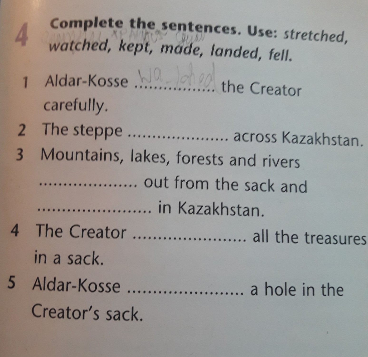 1.stretched 2.fell 3. landed 4. kept 5. made