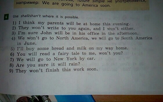 Меняется предложение только эти 4) We shan't go North America, we shall go to South America in June. 5) I shall buy some bread and milk on my way home. 7) We shall go to New York by car.