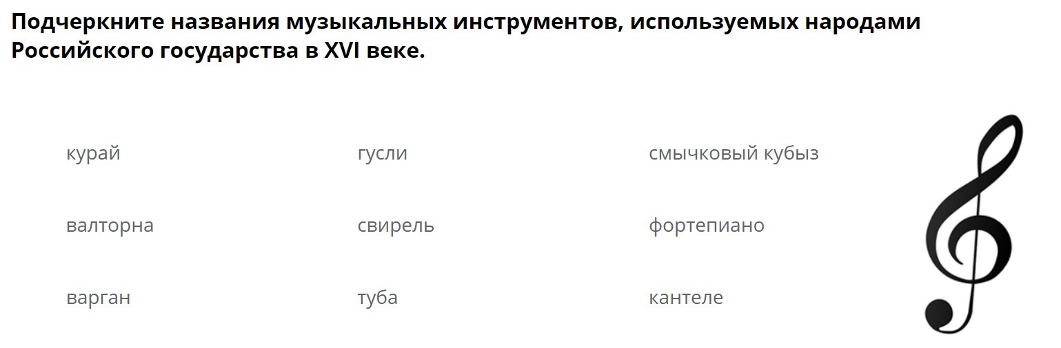 Подчеркните названия музыкальных инструментов, которыми пользовались народы, входящие в Российское государство в XVI веке