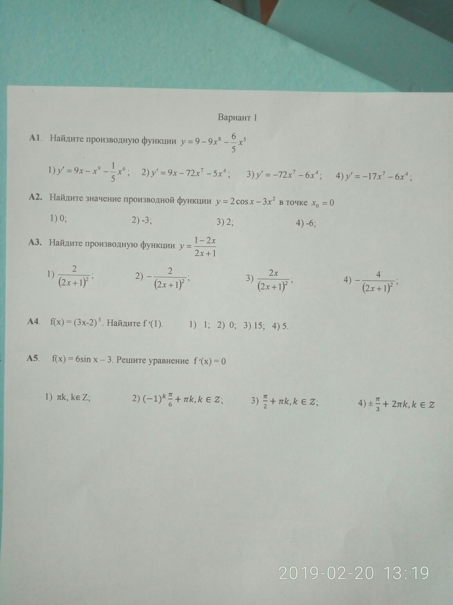 2.;y'=-2sin x-6x\y'(0)=0\\3.;y'=frac{-2(2x+1)-2(1-2x)}{(2x+1)^2}=frac{-4x-2-2+4x}{(2x+1)^2}=-frac4{(2x+1)^2}\\4.;f'(x)=5(3x-2)^4cdot3=15(3x-2)^4\f'(x)=15(3-2)^4=15cdot1=15\\5.;f'(x)=6cos x\6cos x=0\cos x=0\x=fracpi2+pi n,;ninmathbb{Z}