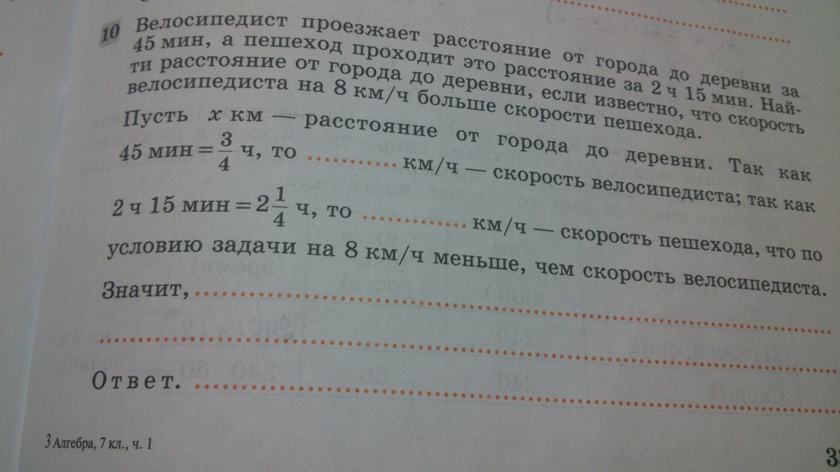 45 мин=45/60 ч=3/4 ч,2ч15мин=2ч15/60=2+1/4=9/4 ч.Пусть скорость движения пешехода х км/ч,тогда скорость движения велосипедиста найдем,как (х+10) км/ч.Путь,который проделал велосипедист найдем,как 3/4(х+8),а пешеходом,как 9/4 х.Но это один и тот же путь