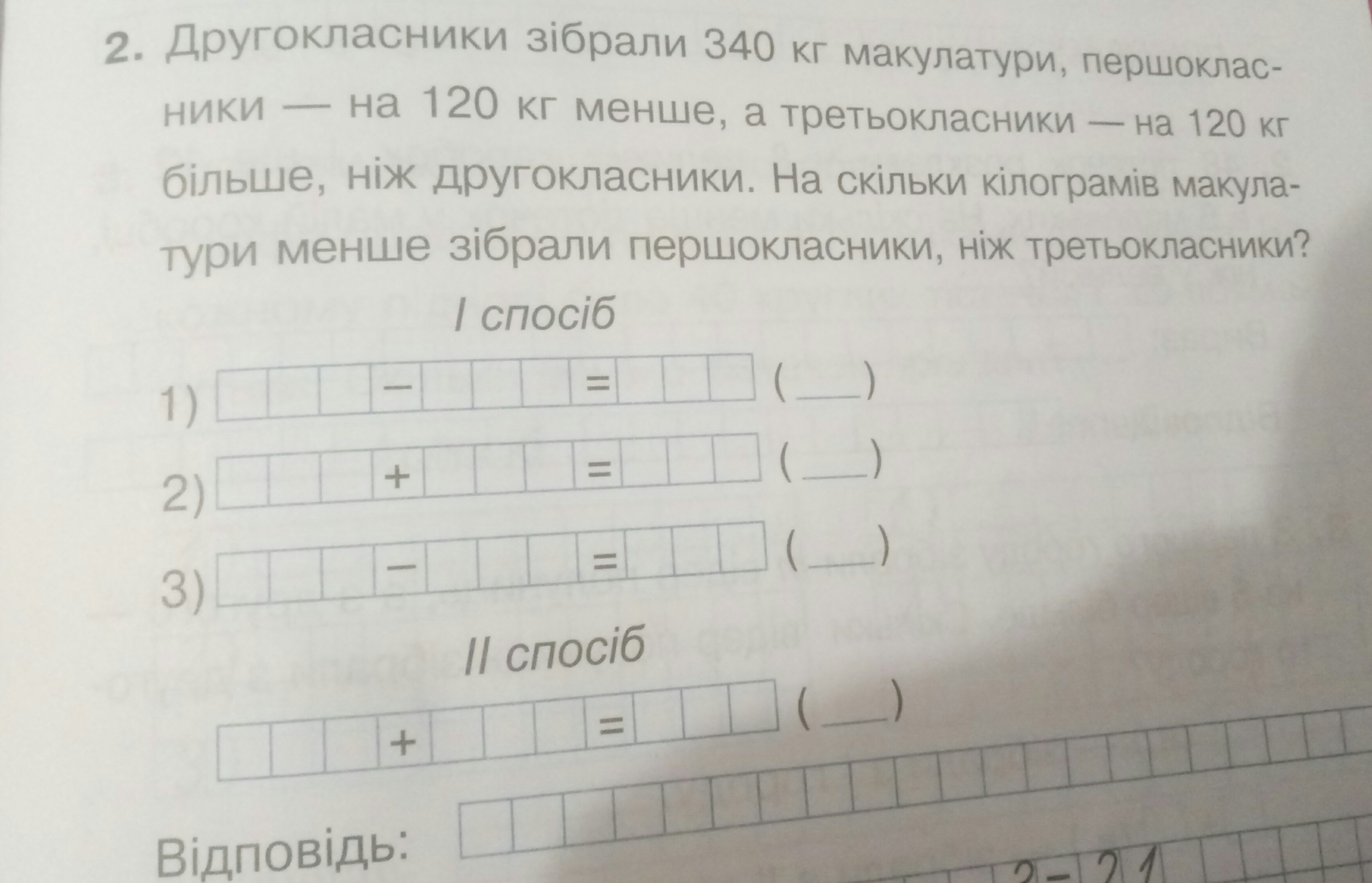 1) 340 - 120 = 220 (кг) - собрали первоклассники.