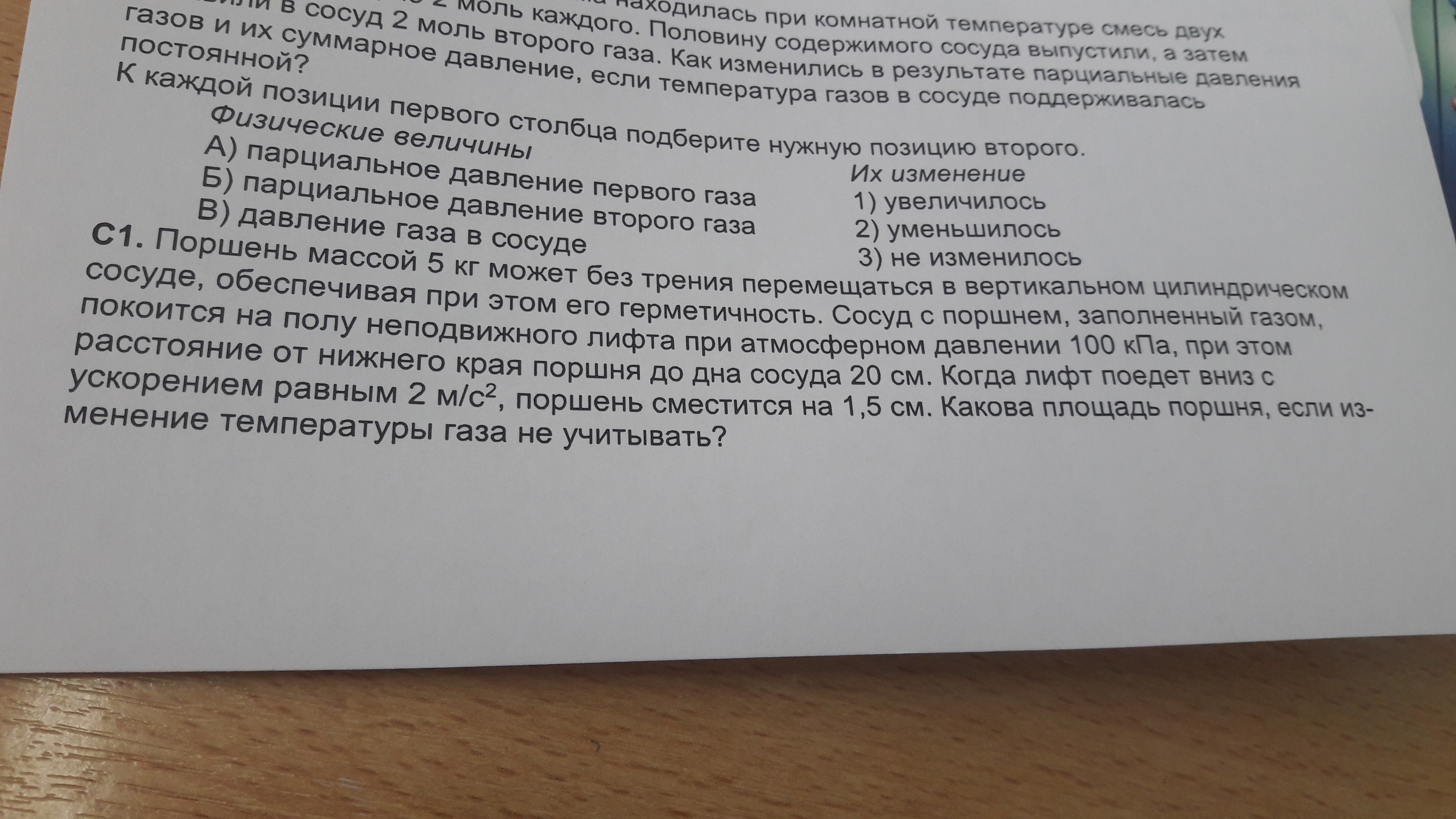 Потом когда лифт начал двигаться вниз, то вес поршня уменьшился и стал m(g-a), поэтому новое условие равновесия p2*S=p0*S+m(g-a); p2=p0+m(g-a)/S. Кстати поэтому поршень вверх сместился, потому что стал давить с меньшей силой