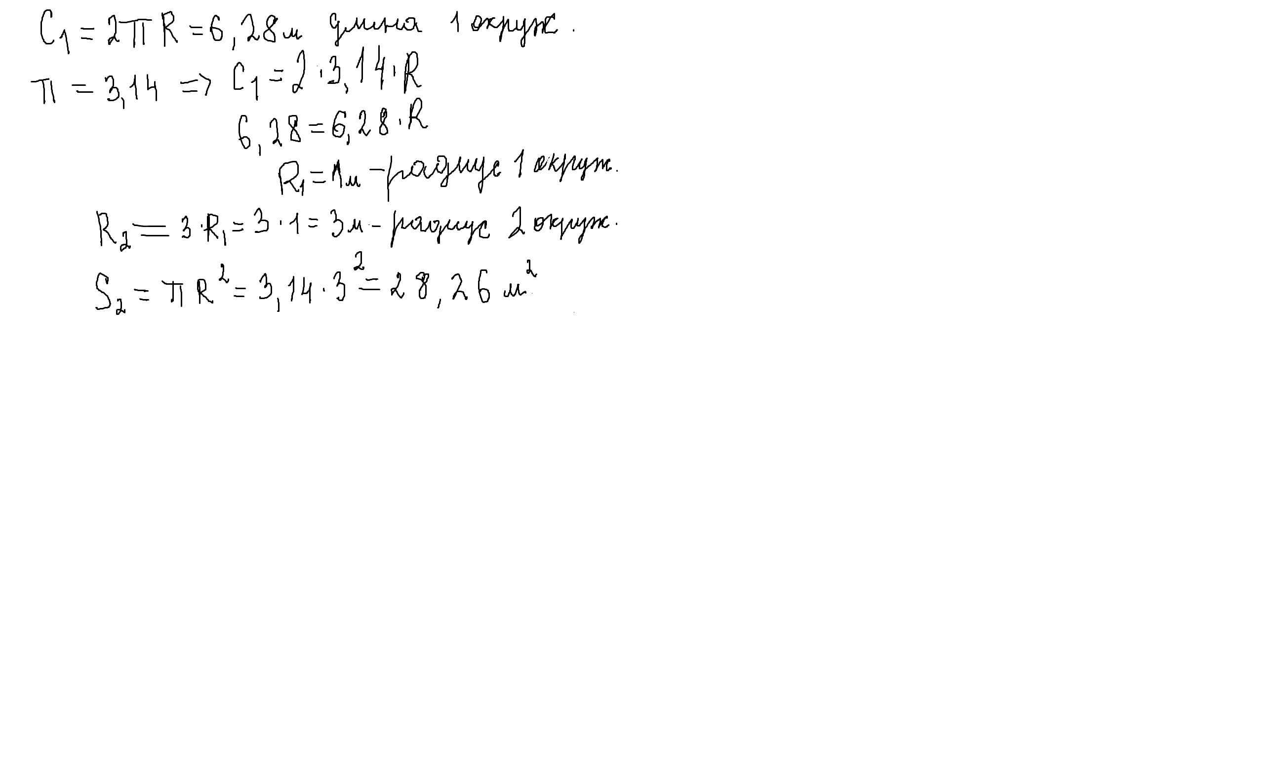 Длина первой окружности равна 6,28 м. Найдите площадь круга, ограниченного окружность, радиус который в 3 раза больше радиуса первой окружности. Число П округлите до сотых