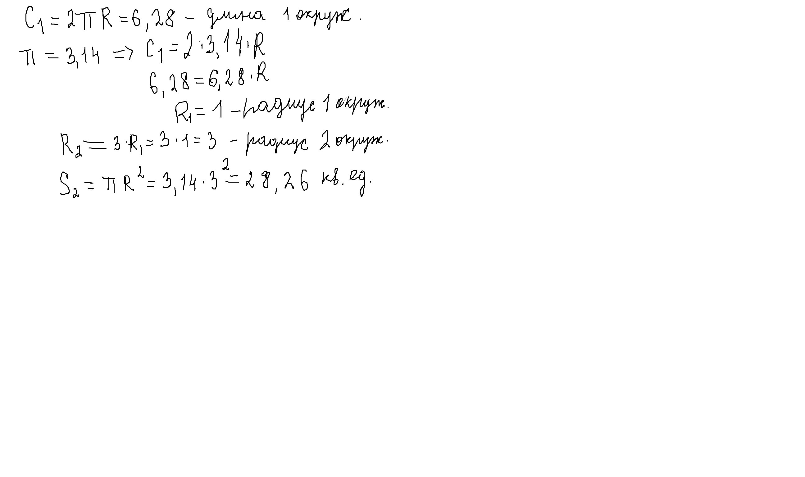 Длина первой окружности равна 6,28.Найдите площадь круга, ограниченного окружность, радиус которой в 3 раза больше радиуса первой окружности. Число П округлите до сотых